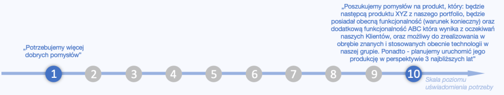 Potrzeba poszukiwania nowych pomysłów powinna być bardziej konkretna. Komunikat można sformułować na przykład tak: „Poszukujemy pomysłów na produkt, który: będzie następcą produktu XYZ z naszego portfolio, będzie posiadał obecną funkcjonalność (warunek konieczny) oraz dodatkową funkcjonalność ABC która wynika z oczekiwań naszych Klientów, oraz możliwy do zrealizowania w obrębie znanych i stosowanych obecnie technologii w naszej grupie. Ponadto – planujemy uruchomić jego produkcję w perspektywie 3 najbliższych lat”.