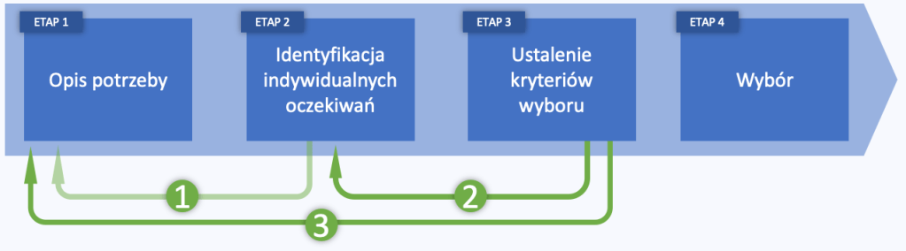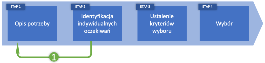 Czy można zacząć od tego kroku? Jeżeli próbuję wyobrazić sobie jak odpowiedziałbym na pytanie o moje potrzeby, nie wiedząc czego mają dotyczyć, to jest to raczej trudne. Etap ten jest jednak dobrą okazją do sprecyzowania opisu potrzeby i przesunięcie jej na osi bliżej „10”-ki. Dlatego warto po tym etapie wrócić do poprzedniego i zweryfikować opis potrzeby.